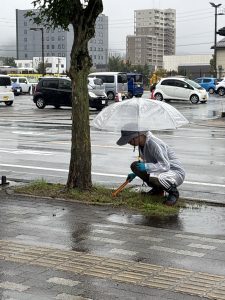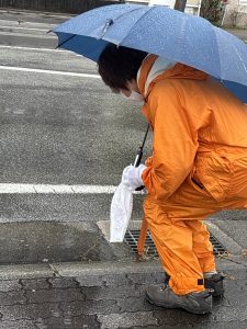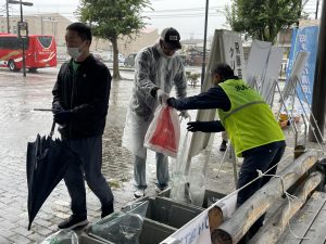 この日は前夜から雨が降り続いており、参加者は雨着を装着し、高山市役所を起点に40分ほど清掃活動を行いました。