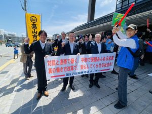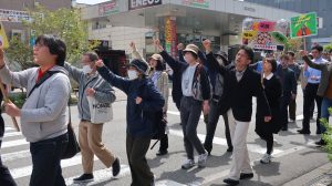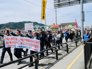 式典終了後の第二部、参加者は市街地へと繰り出しアピール行進を展開。プラカードを高く掲げ、街中に力強いシュプレヒコールを響かせました。