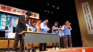 最優秀賞の神岡鉱山労働組合をはじめ3組合に賞品が贈られました。職場の課題や団結を訴える趣向を凝らした力作の数々が、会場やアピール行進に華を添えました。※14組合のプラカードは、後日UPします!